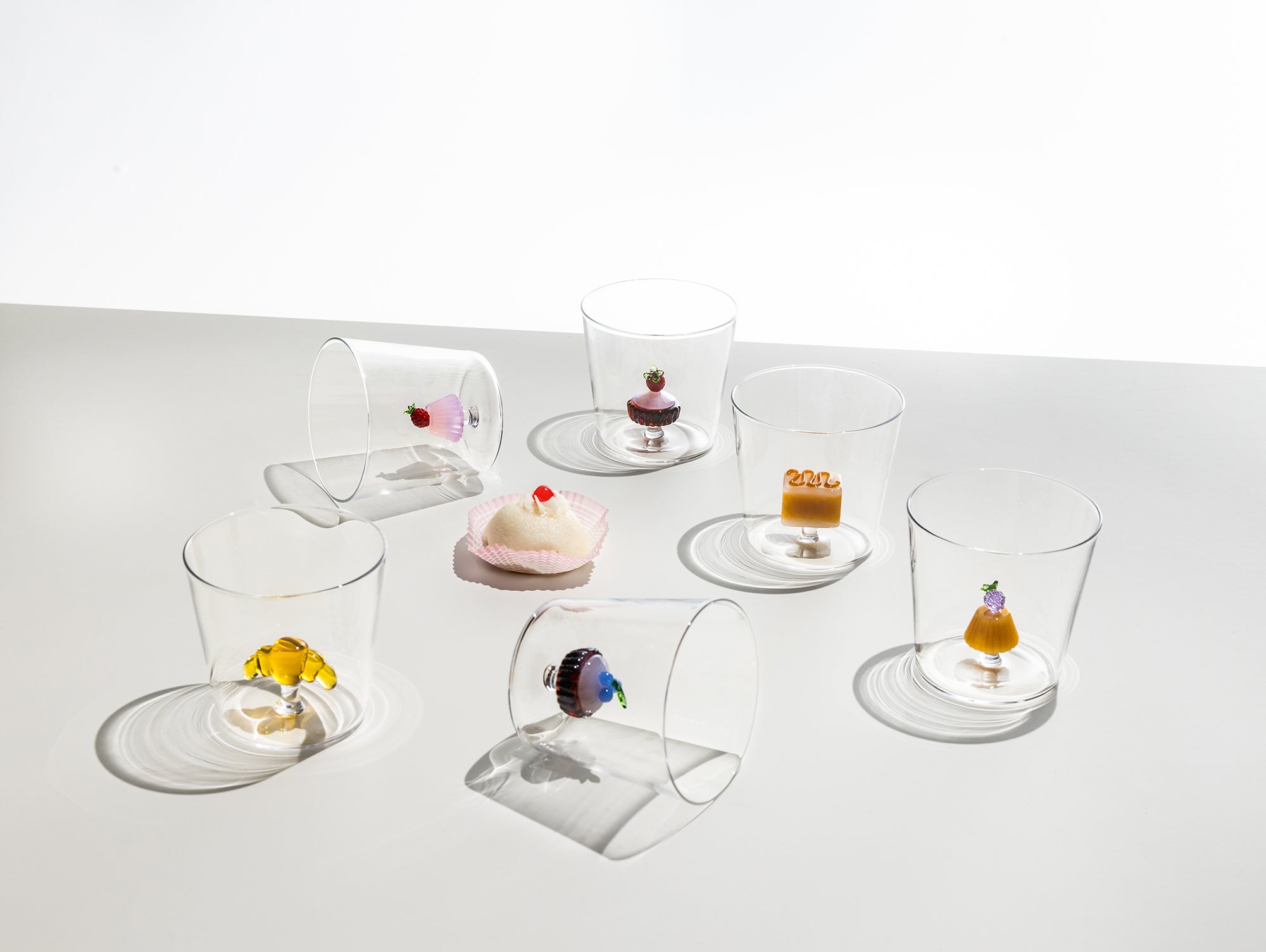 Aggiungi un elemento di conversazione e un tocco di dolcezza alla tua tavola con questo bicchiere che unisce funzionalità quotidiana e arte decorativa.