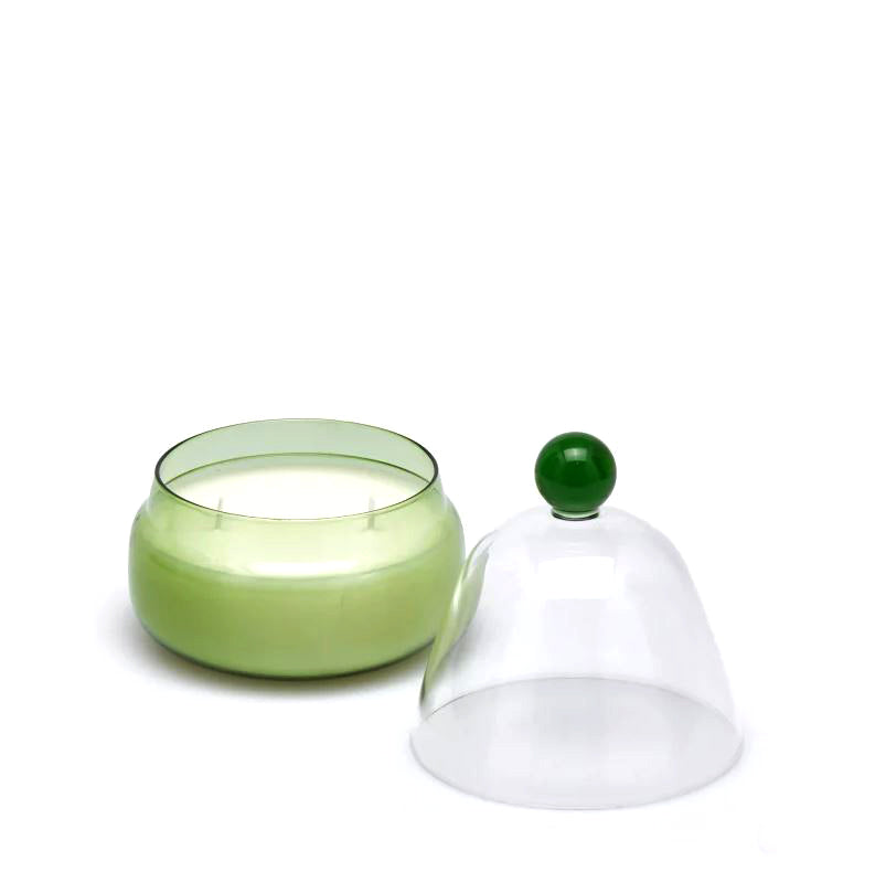 Il design della candela "DOT." si distingue per il suo stile unico. Il contenitore in vetro verde aggiunge un tocco di originalità e freschezza, mentre la cupola in vetro trasparente sovrastata da un pomello verde protegge la cera e mantiene intatta la fragranza quando non in uso. Una volta esaurita, il contenitore può essere riutilizzato come elegante oggetto decorativo o portagioie.
