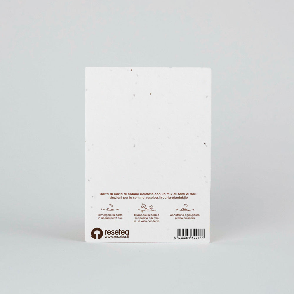 Stampata su carta di cotone riciclato con semi di un mix di fiori, è completamente biodegradabile. Ogni cartolina è accompagnata da una busta in carta vegetale, per un regalo 100% eco-friendly dall’inizio alla fine.