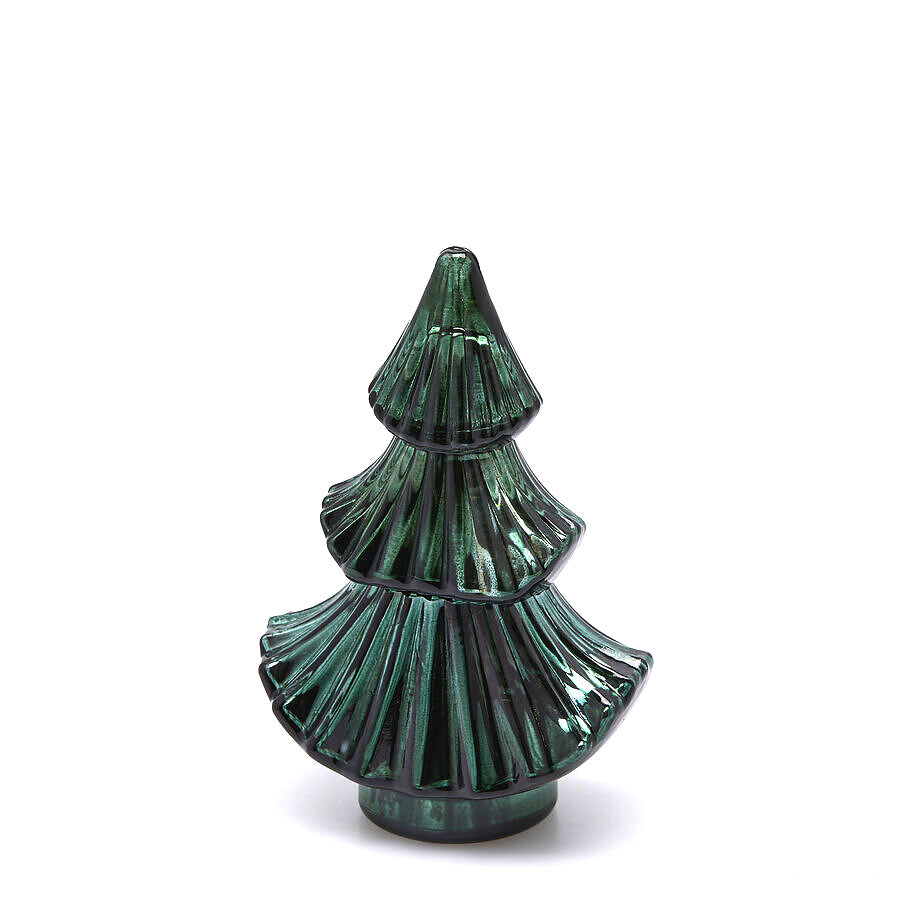 Accendi la magia del Natale con la candela profumata EDG a forma di albero di Natale. La sua forma elegante a pino stilizzato e il vetro verde scuro lucido con effetto plissettato donano un tocco di raffinatezza a qualsiasi ambiente. Il contenitore è riutilizzabile, perfetto per aggiungere un dettaglio elegante a credenze, tavoli o caminetti.