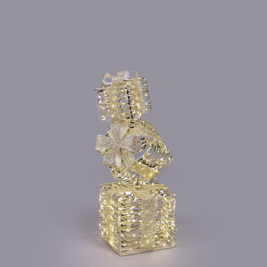 Porta la magia delle feste nei tuoi ambienti con il Decoro Pacco Regalo Stripes Oro. Un complemento luminoso elegante e scenografico, impreziosito da 350 microled a luce calda fissa che creano un effetto raffinato e accogliente.