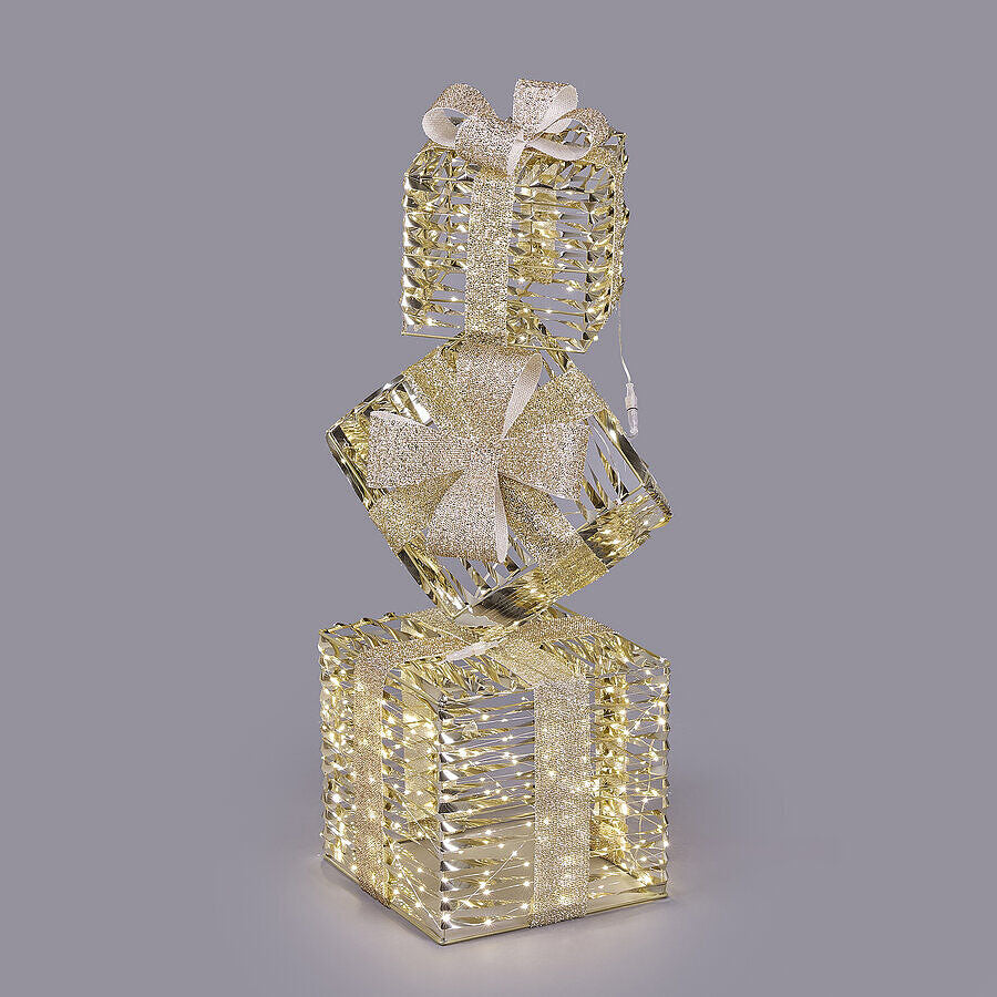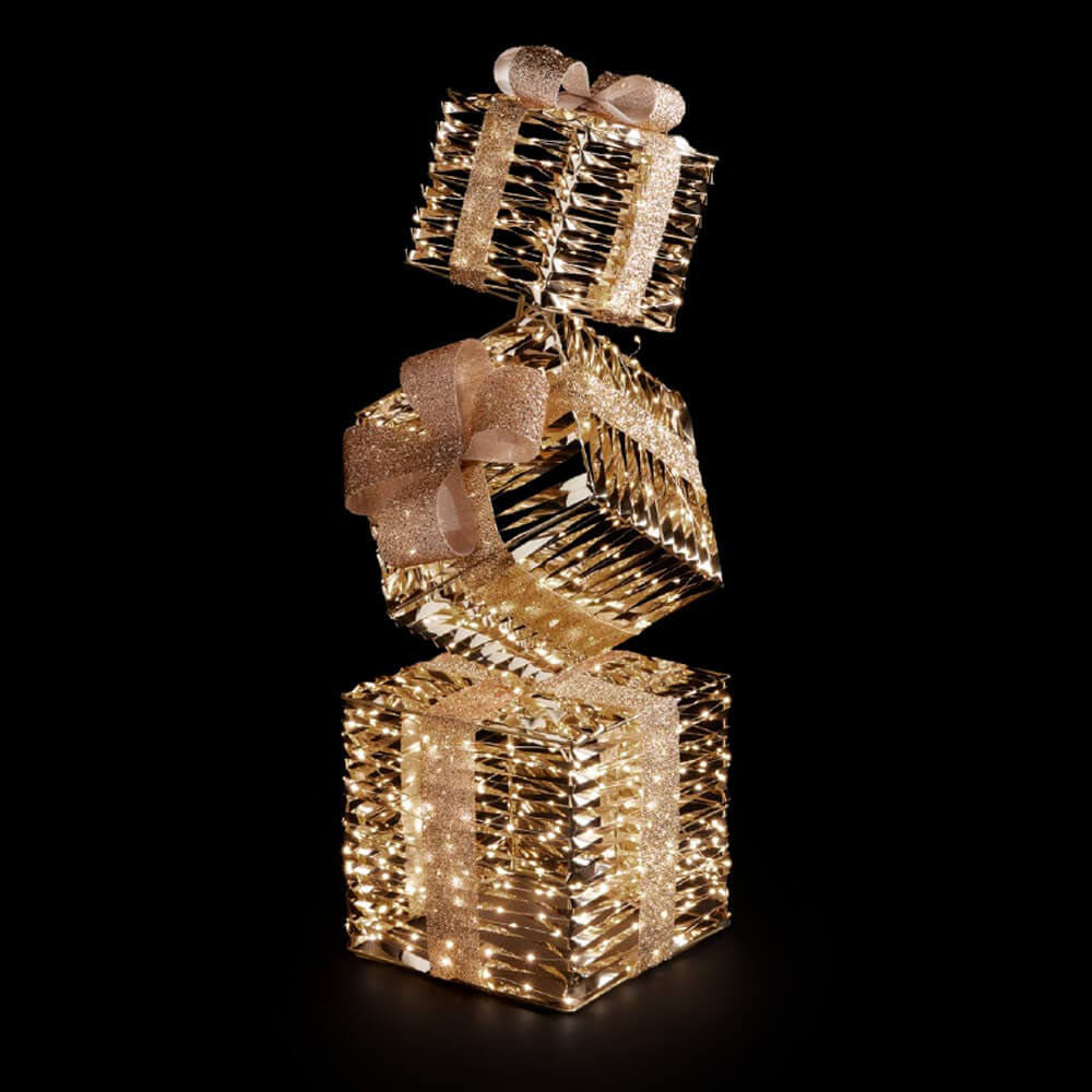 Porta la magia delle feste nei tuoi ambienti con il Decoro Pacco Regalo Stripes Oro. Un complemento luminoso elegante e scenografico, impreziosito da 600 microled a luce calda fissa che creano un effetto raffinato e accogliente.