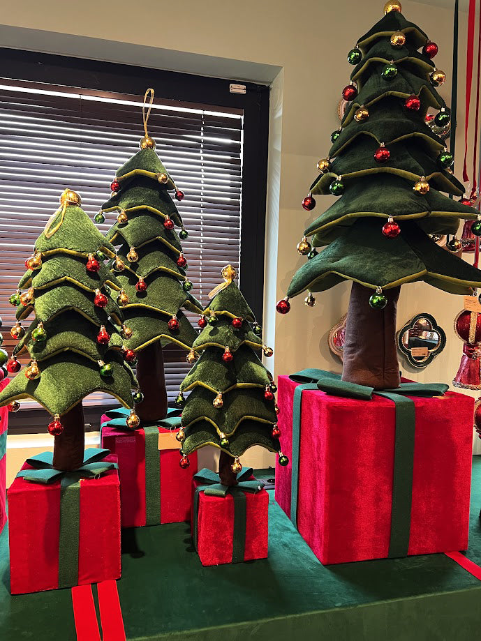 Il pino decorativo è rivestito in tessuto morbido, conferendo un aspetto sofisticato e festoso. La struttura interna in metallo telescopica garantisce stabilità e resistenza, permettendo di adattare l’altezza secondo le esigenze. Facile da appendere, questo decoro è pronto a diventare il protagonista del tuo allestimento natalizio.