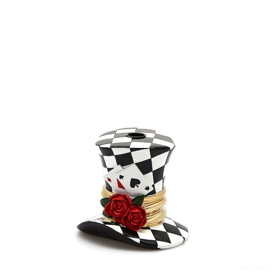 Ispirato al mondo magico di Alice nel Paese delle Meraviglie, questo portacandela è realizzato in poliresina di alta qualità e presenta un design elegante e giocoso: un cappello a cilindro decorato con motivo a scacchi bianco e nero, carte da gioco e dettagli preziosi come rose rosse e fascia dorata.