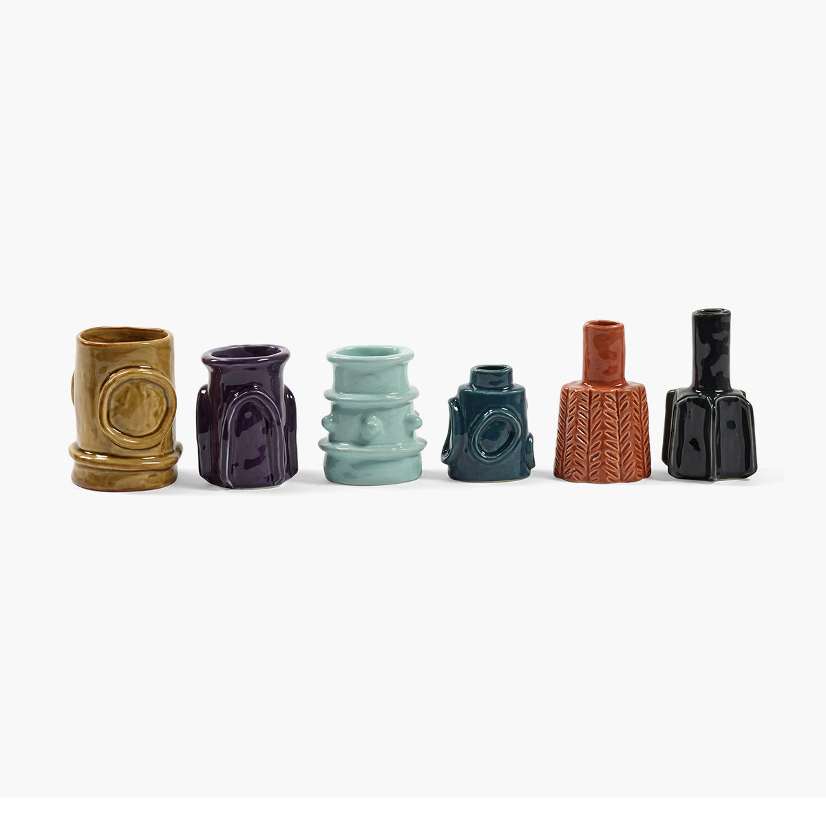 L'arte della decorazione fatta a mano con i 6 mini vasi Molly in ceramica smaltata colorata di Serax. Realizzati artigianalmente, la loro singolarità offre un fascino pazzesco per una decorazione funzionale e durevole.