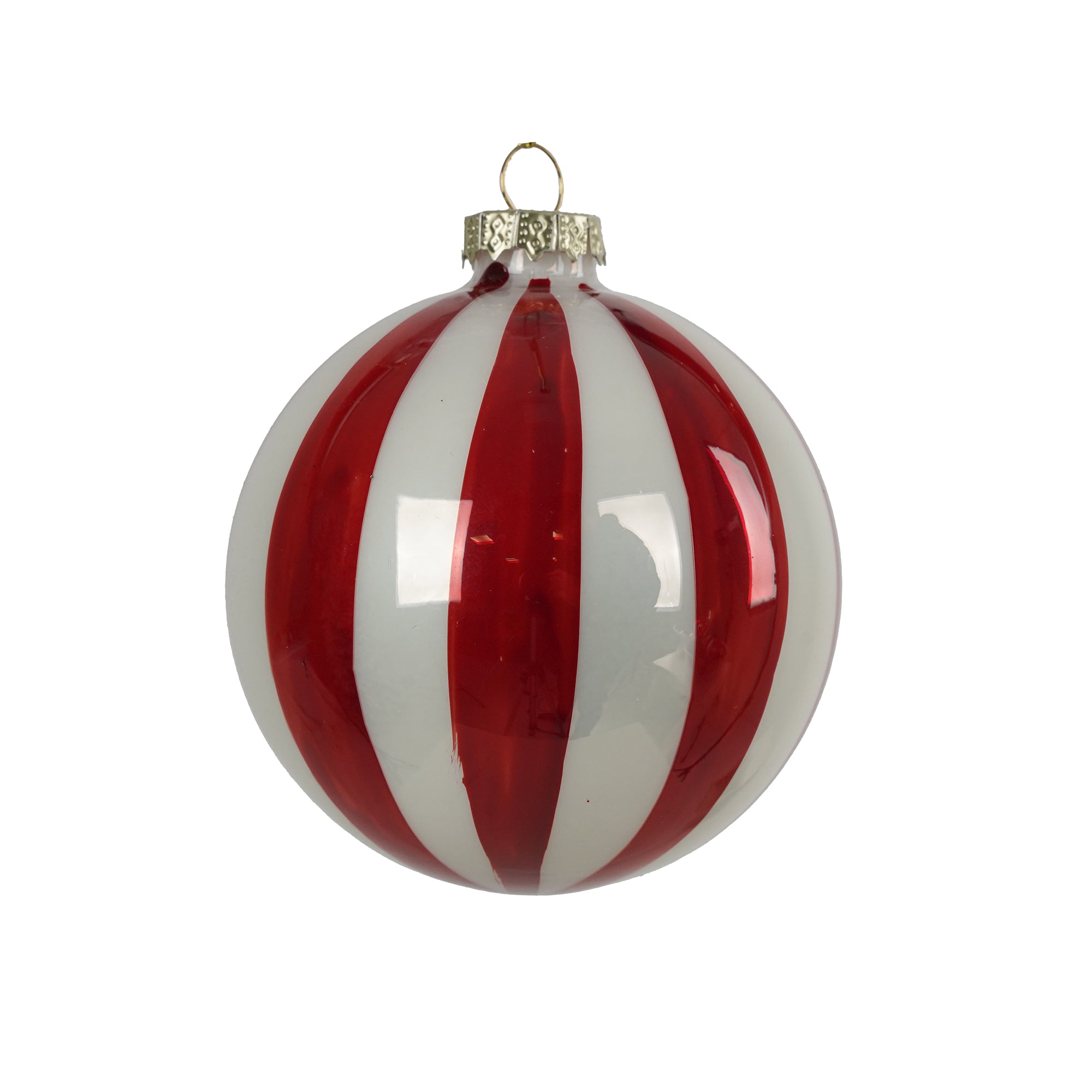 Porta un tocco di eleganza classica e tradizione natalizia nel tuo albero con questa pallina decorativa in vetro dal design a strisce rosse e bianche.