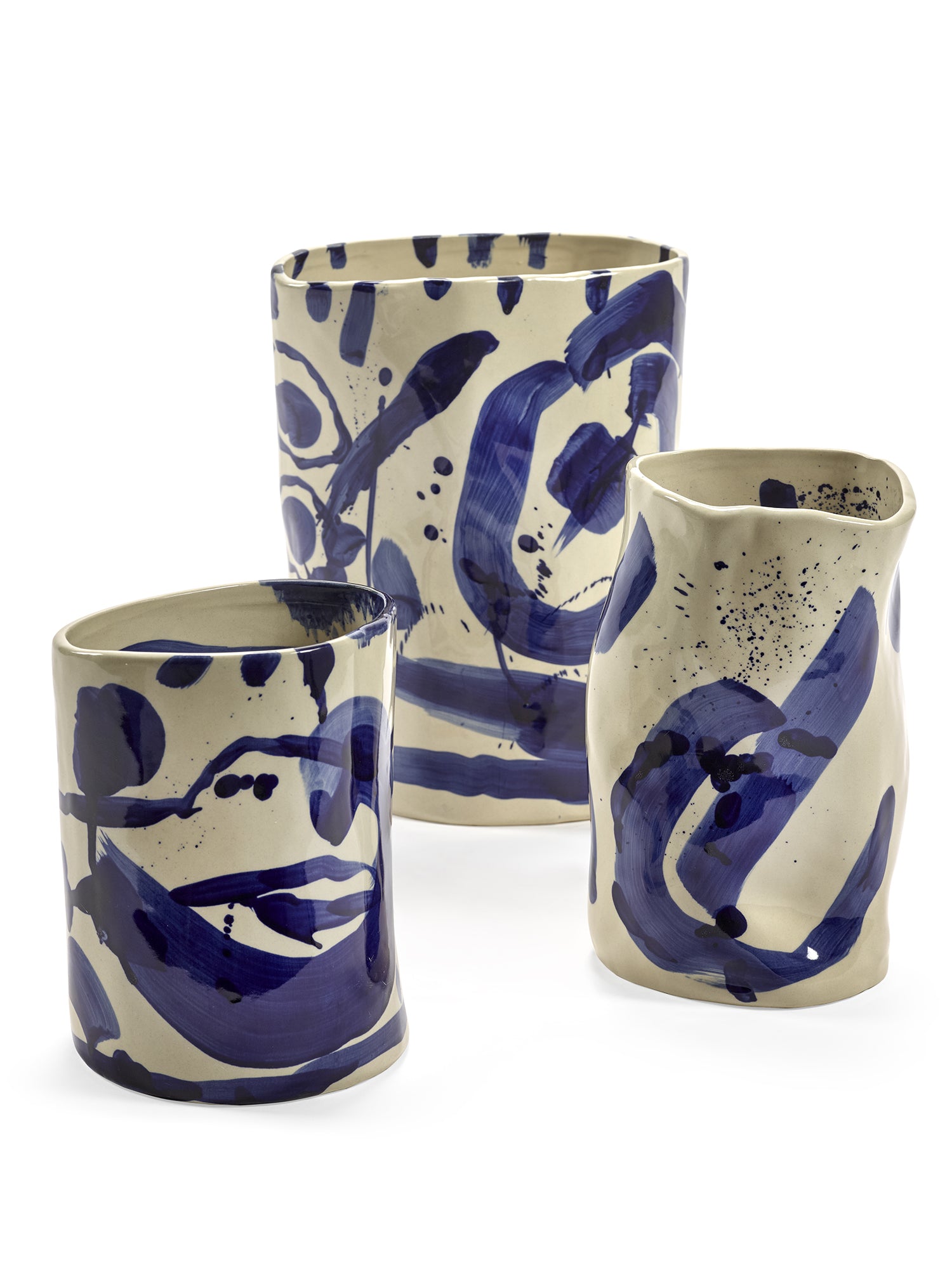 La superficie è dipinta a mano con decorazioni che ricordano la calligrafia orientale, dove spontaneità e ispirazione del momento hanno un ruolo centrale. Le tonalità di blu e beige smaltato conferiscono al vaso un carattere raffinato e contemporaneo, perfetto sia come complemento decorativo sia come contenitore per fiori secchi o freschi.