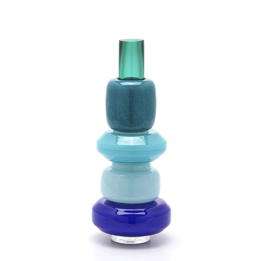 Con una combinazione di tonalità che spaziano dal verde, al turchese, al blu cobalto e all'azzurro, questo vaso è l'ideale per ospitare un singolo fiore a stelo lungo, rami decorativi o per brillare come oggetto d'arredo autonomo. Il design slanciato e la finitura lucida lo rendono un punto focale perfetto per tavolini, console o scaffali.