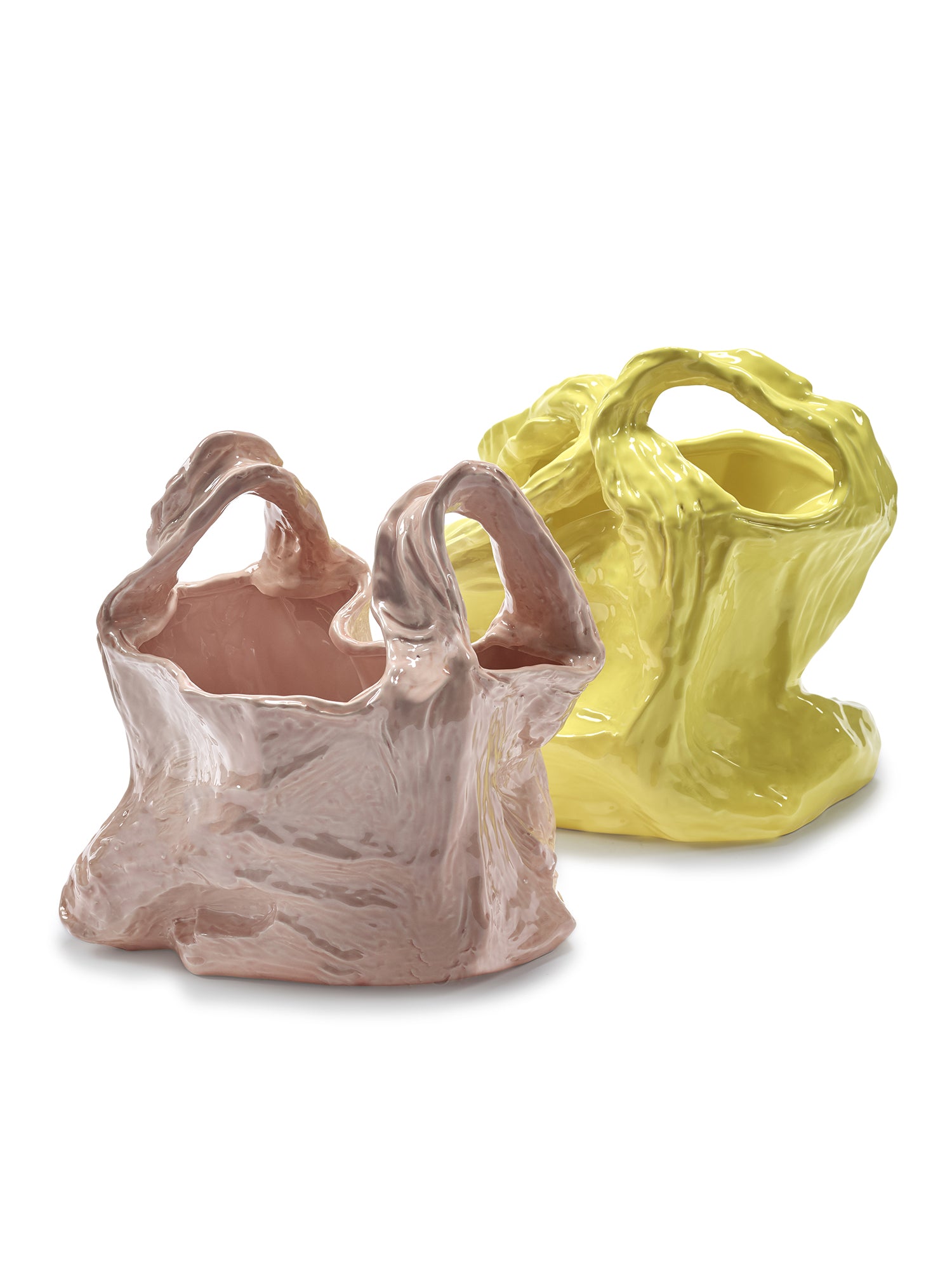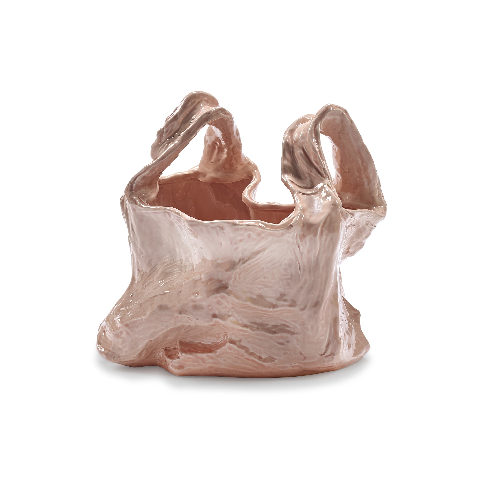Il Vaso Gala di Serax, disegnato dall'artista ucraina Kseniya Kravtsova, è un'opera d'arte che unisce estetica e riflessione ecologica. Questo vaso in ceramica color rosa cipria trasforma un oggetto effimero, un sacchetto di plastica, in un complemento d'arredo duraturo e di grande impatto visivo e concettuale.